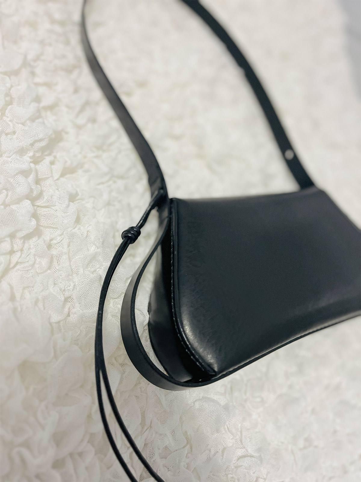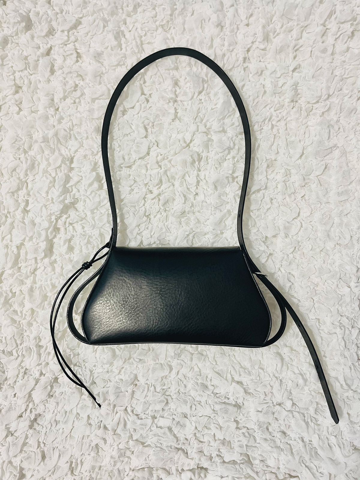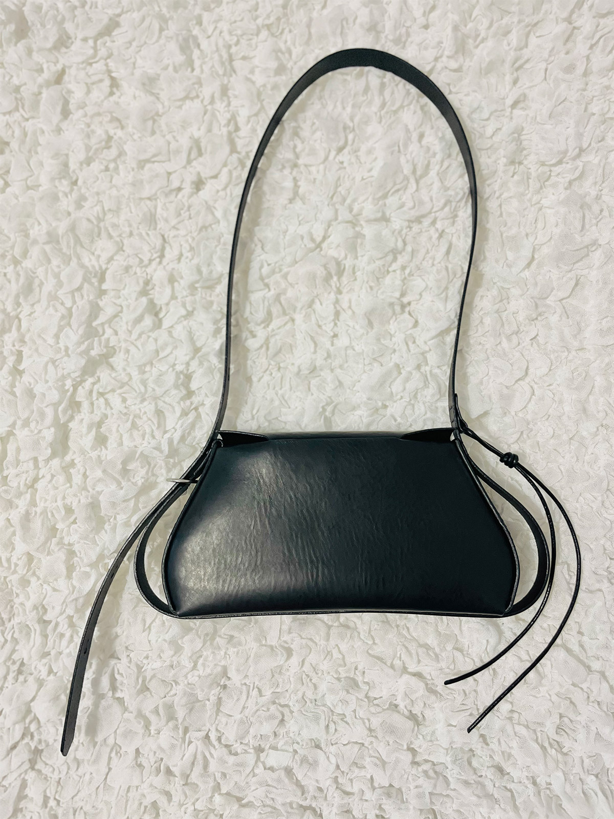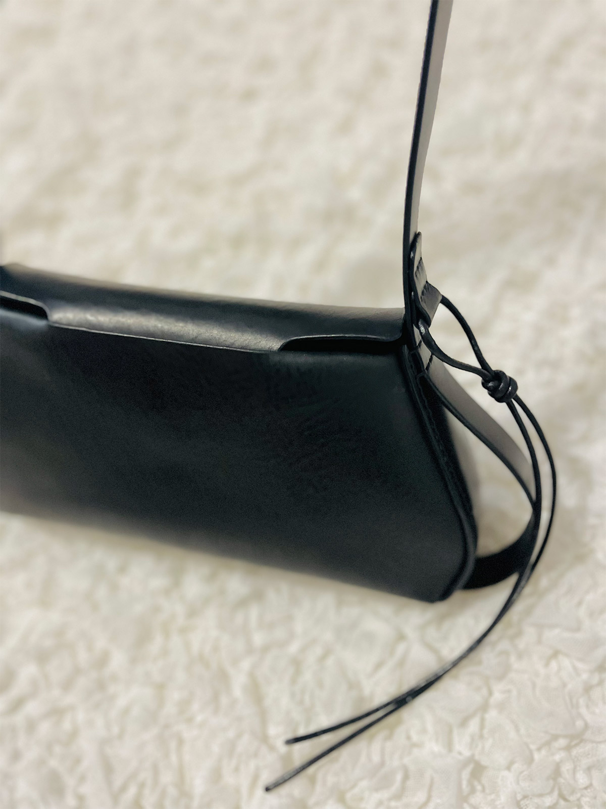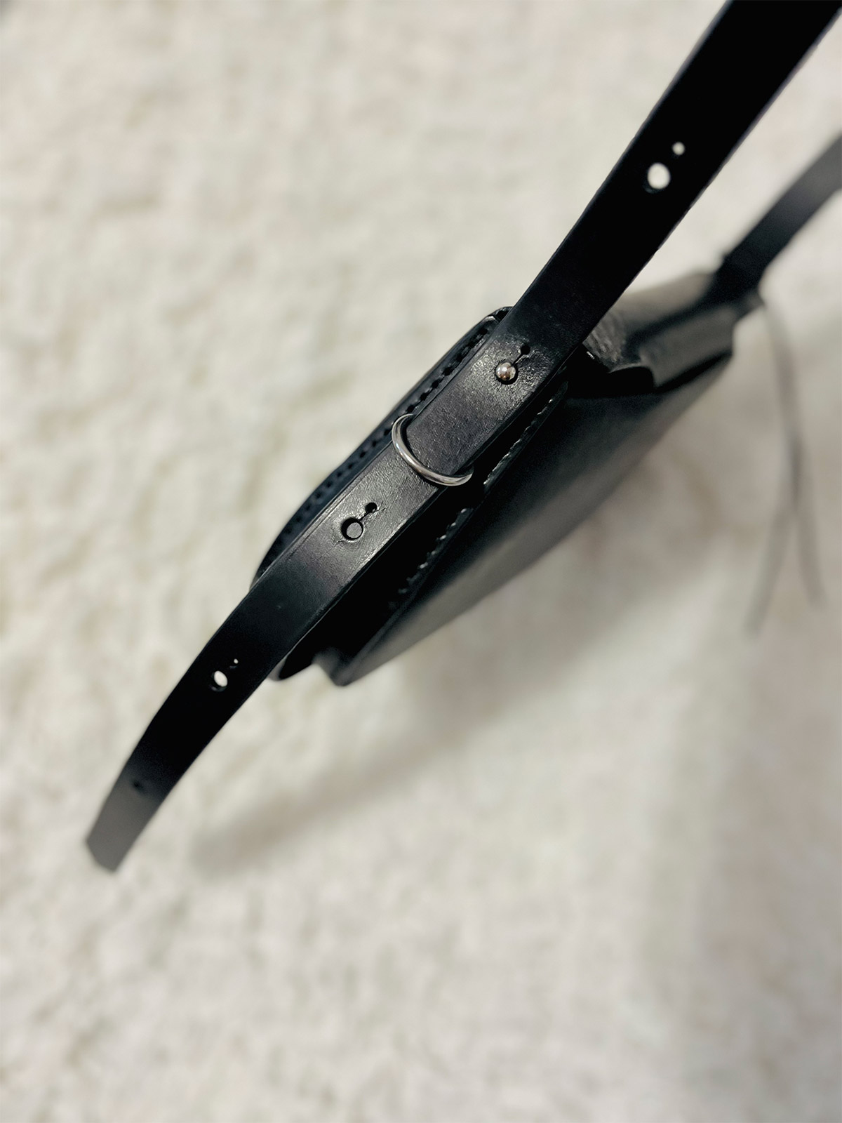 La curva morbida in questo angolo deriva dalla transizione della pelle dalla superficie del corpo alla base. Realizzando con cura i tagli ai punti in cui i singoli pezzi di pelle si intersecano, abbiamo ottenuto una transizione senza soluzione di continuità. La tracolla può essere notevolmente allungata per consentire un doppio utilizzo: come borsa a tracolla o come borsa a spalla.